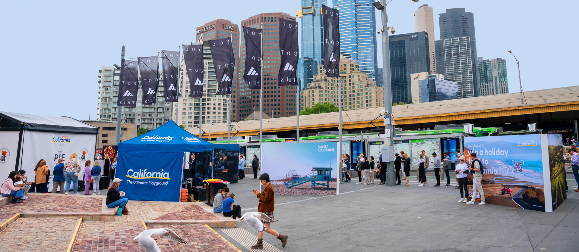 Federation Square became a California road-trip experience, complete with Curtis serving 2,000 pies, live DJ sets, and bold destination backdrops for broadcast and social content.