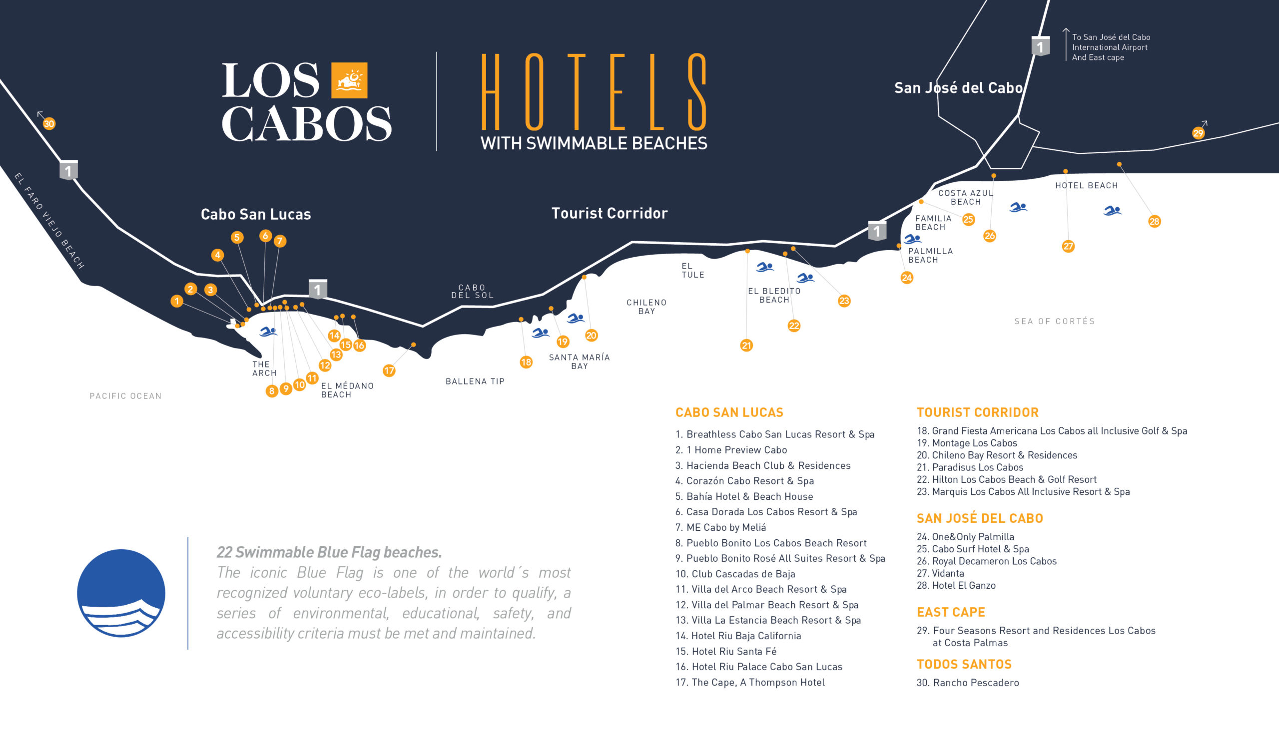Los Cabos currently has 22 beaches that are swimmable and blue flag rated, including Santa Maria Beach where Montage Los Cabos is located; Palmilla Beach where One&Only is located; Chileno Beach where Chileno Bay Resort & Residences is located, among others. Please visit our website for all the information regarding swimmable beaches in Los Cabos.